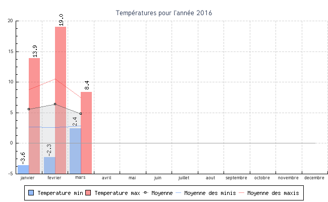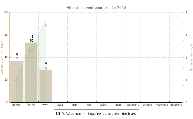 | fevrier | -2.3 °C | 2.6 °C | 19.0 °C | 10.5 °C | 6.4 °C | 2.5 km/h | 53.1 km/h | NNE |
